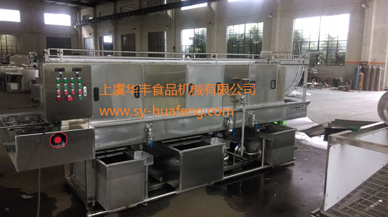 2.清洗段分為四組噴淋管,第一組為熱堿水,第二組為約80°C熱水,第三組為自來水,第四組為消毒殺菌水;四組噴淋除第三組為自來水外均設有單獨循環過濾水箱,第三組自來水作為補充水回收至第二水箱,加熱后部分臟水排出,第三水箱消毒水由人工調好濃度后補加;第一、第二水箱內設有蒸汽加熱管,溫度常溫至100°C自由設定,自動控溫;